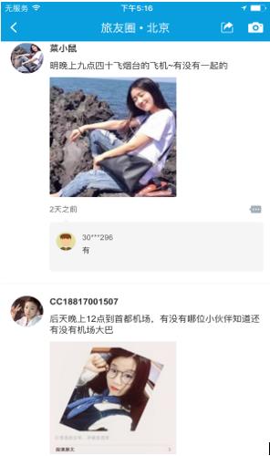 2,旅游者在“旅友圈”发布出游计划、寻找旅友。“旅友圈”类似于微信的朋友圈,可以随时发布图文信息和状态;咨询问题、邀请结伴同游。
