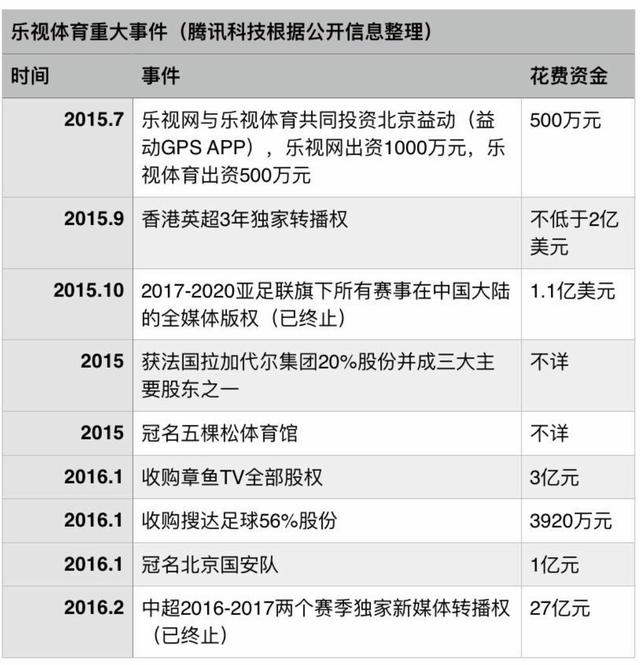 而这一年,从“贾跃亭滞留国外”的阴影中解脱出来的乐视正全速前进。8月发布超级自行车,并与黑龙江体育局展开O2O服务;9月,2亿美元获香港英超3年独家转播权;10月以7500万美元入股拉加代尔体育集团,控股其旗下世界体育集团20%的股份,1.1亿美元买下2017-2020亚足联所有赛事的中国大陆地区全媒体版权;11月与北京鸟巢发起成立乐体创投基金;12月冠名五棵松体育场馆,与海口市政府共建世界级校园足球基地。