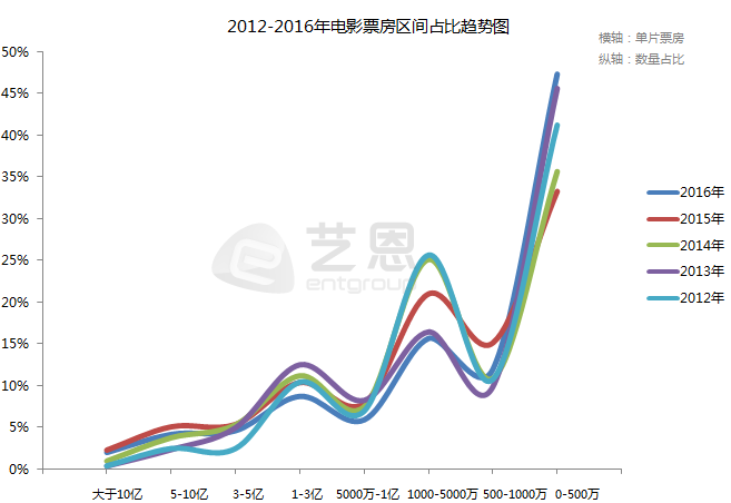 此外,从2012到2016年,紫色块(1-3亿的电影),湖蓝色块(5000万-1亿的电影)和橙色块(1亿到3亿的电影)长度变化不大,这也就是刚才说的两驼峰的部分。而这几部分电影数量,作为中小体量的电影,恰恰是目前最需要加强的。