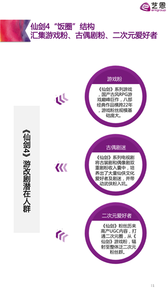 报告显示,《仙剑奇侠传》游戏死忠饭,痴迷古偶剧的迷弟迷妹们,以及脑洞满满的泛二次元爱好者,构成了《仙剑奇侠传四》影视改编旗帜鲜明的“饭圈”结构。庞大而细分的受众基础,为《仙剑奇侠传四》的在迈向影视改编前,早早吃下了一颗定心丸。