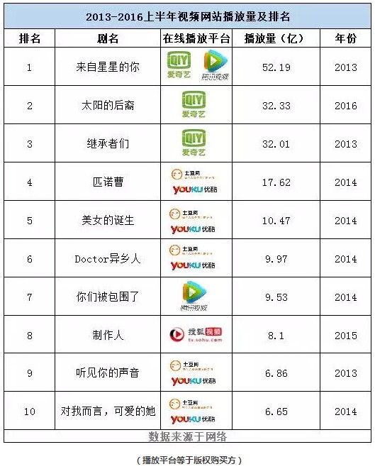 然迟缓也只是暂时的,随着国内视频网站抢山头、划分势力范围有了逆转。相对英美剧来说,价格便宜、已拥有固定粉丝群的韩剧是大多数网站的最优选择。2013年末,《继承者们》被爱奇艺独家引进,长腿欧巴组团来袭,这股风潮更是随着李敏镐登上春晚舞台达到高潮。就在2013、2014年韩剧播放的高峰时期,广电政策颁布使得韩剧影响力有所下滑,但在2016年《太阳的后裔》一经播出,再次引爆全民热潮,韩剧再度强势归来。