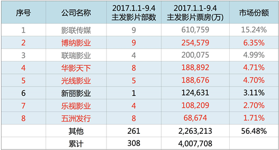 纵观2017年截至目前的电影市场表现,博纳以25.4亿暂列五大民营发行公司首位;华谊兄弟旗下的华影天下凭借《摔跤吧!爸爸》等黑马影片位列第二,交出《嫌疑人X的献身》《春娇救志明》等成绩单的光线排名第三。