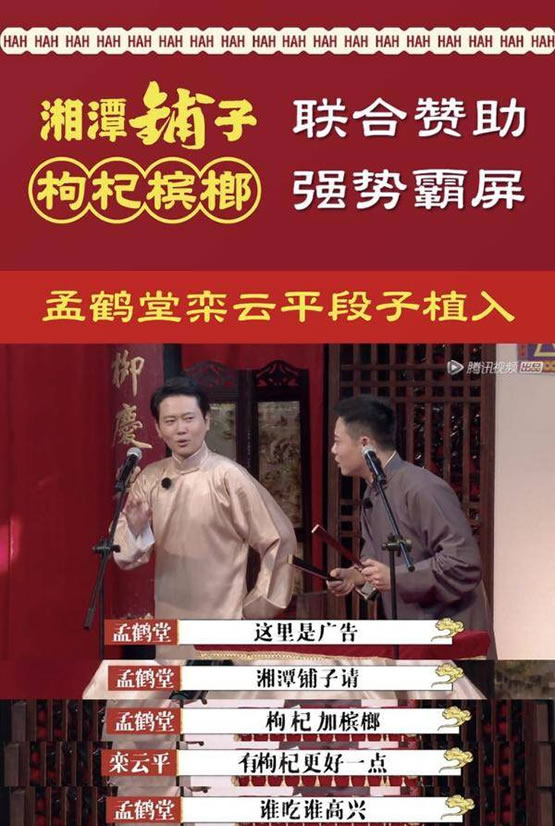 不过,除了官方反复提及的新嘉宾阵容、新赛制玩法外,笔者意外地发现了这季节目赞助商中的新面孔。没错,就是因开创了枸杞槟榔而名声大噪的湘潭铺子。但不同于在《吐槽大会》前四季便持续赞助、且经常客串其他脱口秀综艺的海天,湘潭铺子为何也开始选择赞助脱口秀综艺呢?