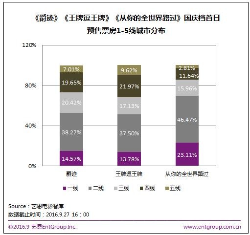 2016年国庆档首日(10.1)预售票房前三名的影片,从城市级别来看,二线城市预售票房占比最高,三部影片体现出不同的城市分布占比格局。影片《爵迹》在三部影片中,三线城市占比最高,票房集中在二、三线城市,一线城市占比较小,增加一线城市的宣传资源投入是不错的选择。《王牌逗王牌》在三、四、五线城市占比最高,为48.72%,喜剧片在四、五线城市较为受欢迎,作为今年国庆档唯一一部喜剧片,必将在四、五线城市大有作为。《从你的全世界路过》二线城市票房占比最高,为46.47%,一线和二线城市占比近7成,可见该片受众主要集中于一线和二线城市,四、五线城市占比仅为14.45%。