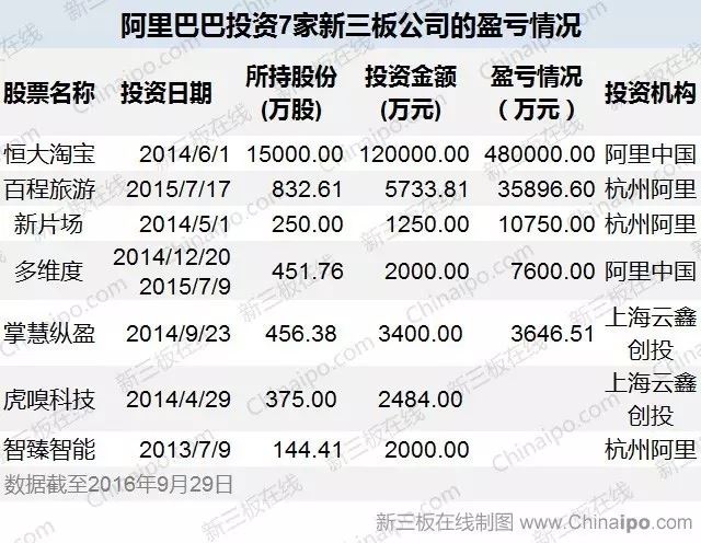 据新三板在线不完全统计,截至2016年9月29日,阿里中国、杭州阿里和蚂蚁金服已经在新三板上投资了7家挂牌公司。