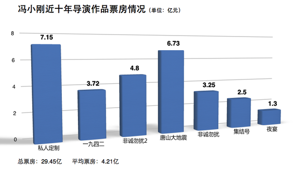 从2006年至今的十年间,葛优共有9部主演电影上映,总票房31.1亿,平均票房3.46亿。同样在这10年间,冯小刚共有7部导演作品上映,总票房29.45亿,平均票房4.21亿。在这众多作品中,有4部是冯小刚与葛优合作的,它们分别是《私人订制》、《非诚勿扰2》、《非诚勿扰》、《夜宴》,总票房16.5亿,平均票房4.13亿。